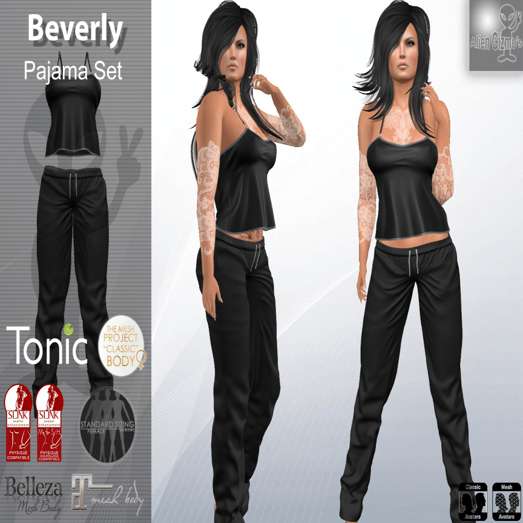 Beverly Pajamas in Black. It fits Belleza, Eve, Slink, TMP old bodies not the new, Tonic, Maitreya & Classic Avatars. Ad credit to Beazty Merlin!